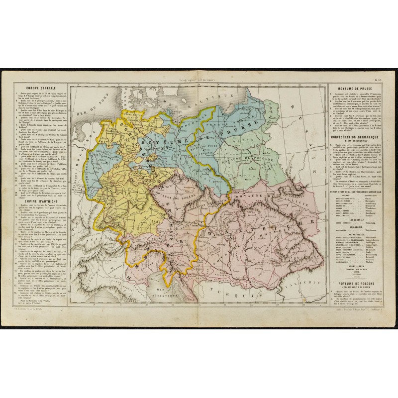 Carte géographique ancienne parue dans un atlas scolaire des années 1860, de Lebrun et Le Béalle chez Jules Delalain (Imprimeur de la Sorbonne à Paris). La planche est composée d'une carte unique représentant l'Europe centrale (Prusse, empire d'Autriche, royaume de Pologne, principautés et états germaniques). Carte politique colorée complétée par hachures topographiques, encadrée par des rubriques de questions scolaires destinées à l'élève.