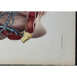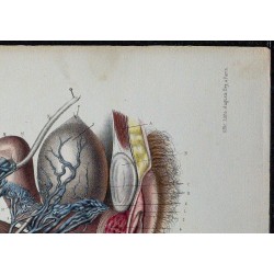 Chromolithographie médicale et anatomique de 1866 dessiné par Émile Beau et extrait d'un atlas médical sur le corps humain des docteurs Bonamy et Broca. Planche anatomique coloriée représentant le réseau veineux du bassin féminin. Les plexus utérin, vaginal et vésical sont mis en évidence avec leurs anastomoses vers les veines iliaques internes et les communications avec les veines honteuses et rectales ; la disposition plexiforme et la convergence vers les troncs veineux principaux sont clairement illustrées.