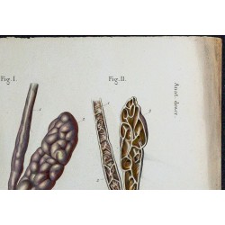 Chromolithographie médicale et anatomique de 1866 dessiné par Émile Beau et extrait d'un atlas médical sur le corps humain des docteurs Bonamy et Broca. Planche illustrant le trajet du canal déférent et ses structures principales : paroi composée de couches musculaires concentriques, muqueuse interne plissée et dilatation ampullaire terminale. Des vues rapprochées montrent les rapports de l'extrémité ampullaire avec la vésicule séminale, précisant la continuité anatomique avant l'émission du liquide séminal.